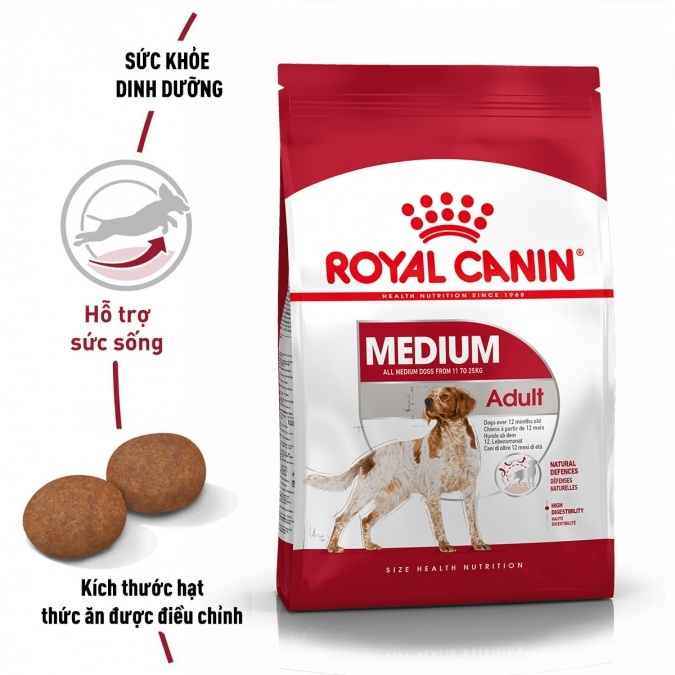 - ROYAL CANIN MEDIUM ADULT dành cho chó trưởng thành từ 11 đến 25kg và trên 12 tháng.