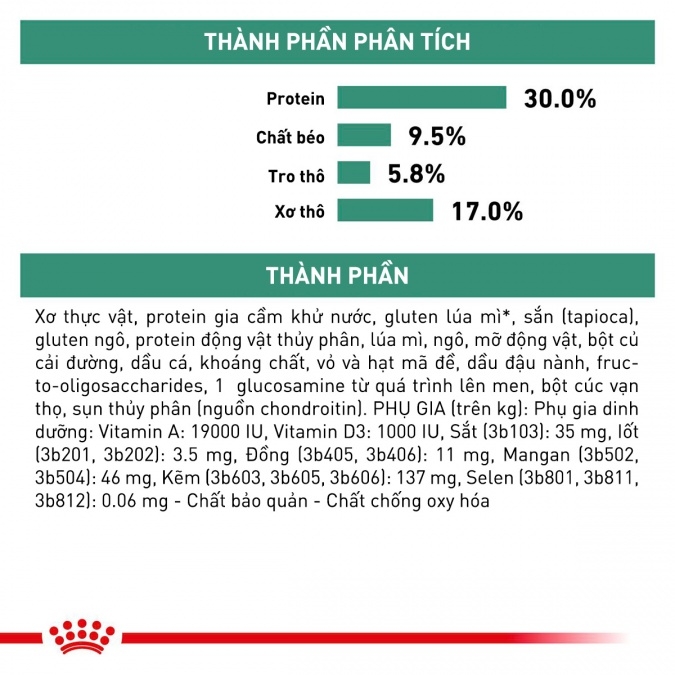 Xơ thực vật, protein gia cầm, gluten lúa mì*, bột sắn, gluten bắp, protein động vật, lúa mì, bắp, chất béo động vật, củ cải đường, dầu cá, khoáng chất, psyllium, dầu đậu nành, fructo-oligo-sacarit, glucosamine, chiết xuất cúc vạn thọ (nguồn lutein), sụn thủy phân (nguồn chondroitin).