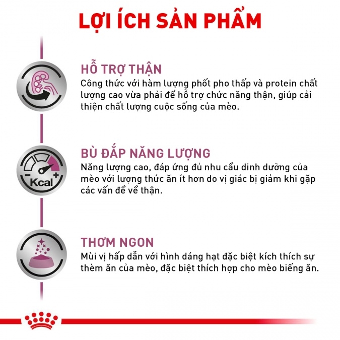 Cho mèo sử dụng chế độ ăn Royal Canin Renal ngay khi nồng độ creatinin* vượt khỏi chỉ số tham chiếu (CKD cuối giai đoạn 2) , trước khi tình hình biến xấu và chuyển thành bệnh mạn tính. Trong trường hợp mèo bỏ ăn có thể chuyển sang chế độ ăn Renal mà không cần bước chuyển đổi (quy tắc đổi thức ăn 7 ngày). Theo dõi sức khỏe thận ở mèo dựa vào bảng chỉ số khoáng chất trong máu (Renal panel): trường hợp lượng canxi trong máu tăng cao hoặc rối loạn chỉ số khoáng chất khác (VD: Hạ nồng độ Kali trong máu).Trong hầu hết các trường hợp, mèo có thể tiếp tục duy trì sử dụng Royal Canin Renal suốt đời.
